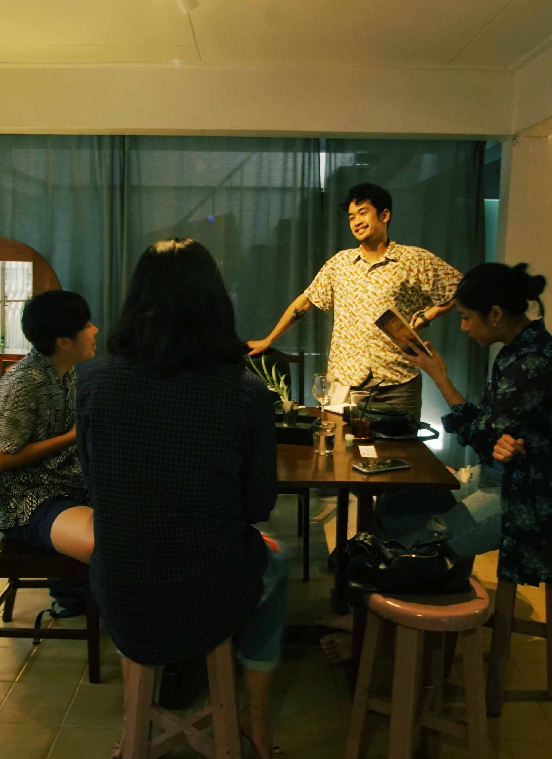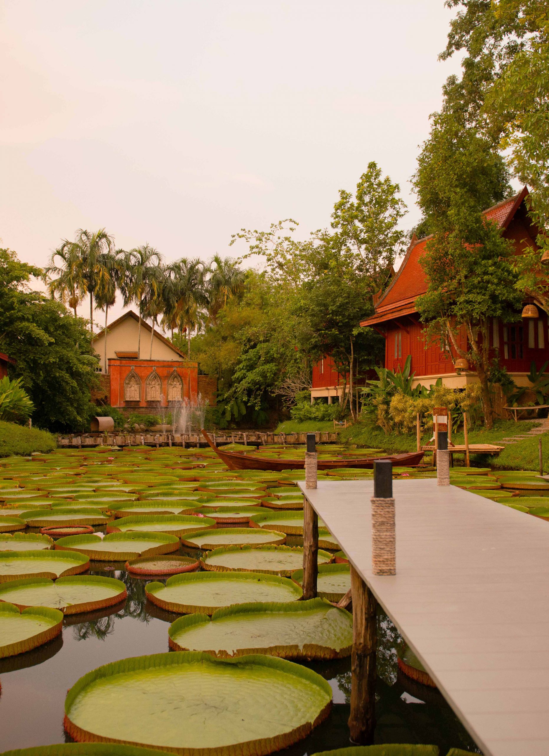 Setting: An airy Thai-style house surrounded by the unique and mesmerising vision of a pond full of giant Victoria Lily pads.