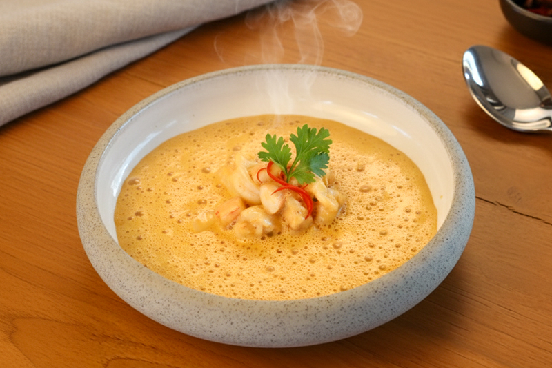 Next, the ‘Tom Yum’ Lobster Bisque presents a brilliant fusion of two beloved soups. The creamy richness of a traditional lobster bisque is enhanced by the bold, spicy-sour notes of authentic Tom Yum Goong, delivering a layered taste experience that is both comforting and surprising.