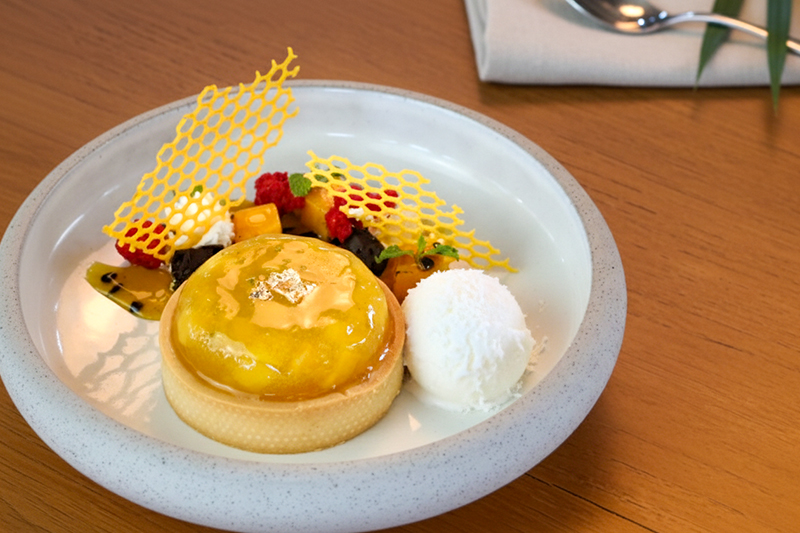 To close, the Mango & Passion Tart Tatin puts a tropical twist on a French classic. Sweet mango and tangy passion fruit are caramelized into a golden tart, paired with refreshing homemade coconut ice cream for a vibrant finale.