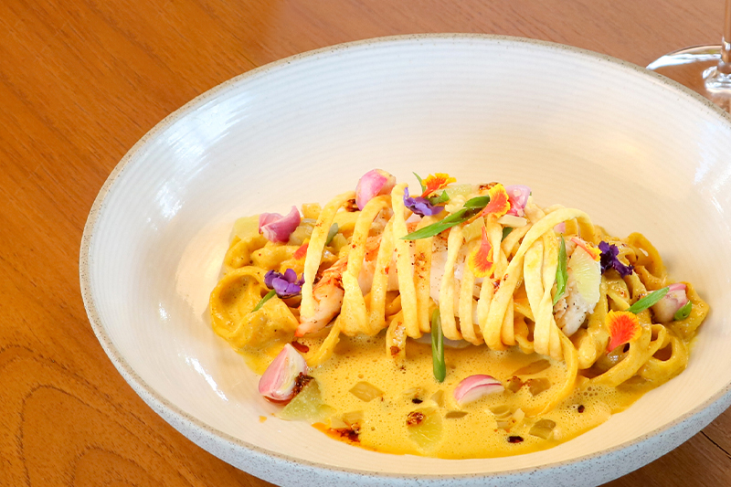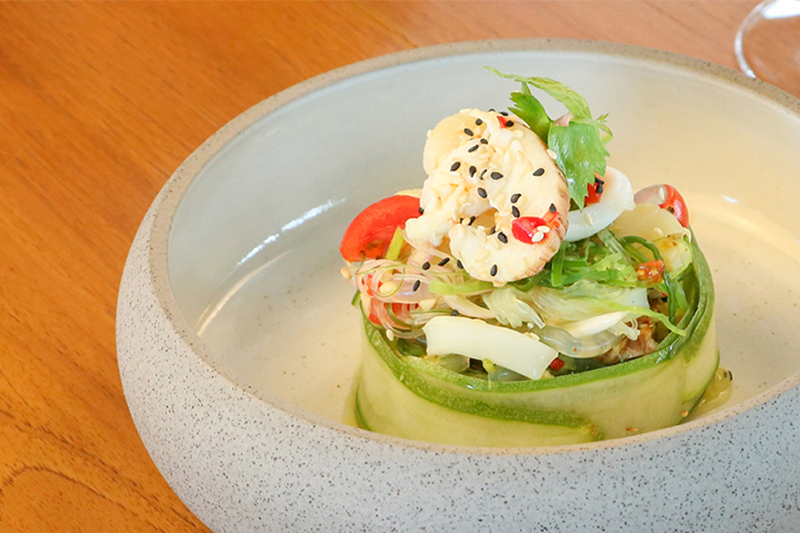The menu highlights Chef Nok’s creative vision, using premium ingredients to reimagine classic dishes. Diners begin with the Spicy Seafood & Glass Noodle Salad, where fine glass noodles are elevated with wakame and nori, then paired with tender Hokkaido scallops, rock lobster, and fresh squid for a vibrant, zesty start.